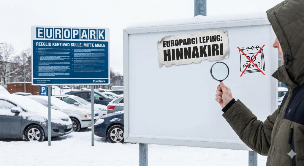 Vaatame EuroPargi parkimislepingu tingimusi (seisuga 25.08.2025, avaldatud nende veebilehel). Punkt 15 ütleb sõna-sõnalt: “EP-l on õigus asjaolu muutumisel, ühepoolselt ja igal ajal muuta käesolevaid Parkimislepingu tingimusi. Teade Parkimislepingu tingimuste muutmise kohta avaldatakse Üürileandja veebilehel www.europark.ee. Teade Parkimislepingu tingimuste muudatuste tegemise kohta ja selle uus terviiktekst või uued tingimused avaldatakse veebilehel vähemalt 30 päeva enne Parkimislepingu tingimuste muudatuste või uue tingimuste jõustumist.” Loe seda veel kord. Veel kord. Mõtle, mida see tähendab. “Vähemalt 30 päeva enne … jõustumist.” See on selge, ühemõtteline ja kohustuslik reegel, mille EuroPark ise kirjutas.