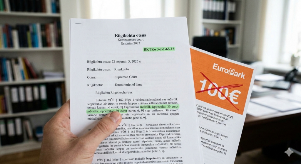 Kohtunikul on selle argumendi puhul väga mugav otsust teha. Ta ei pea leiutama midagi uut. Ta ei pea minema vastuollu Riigikohtu praktikaga. Ta ei pea ignoreerima seadust. Ta lihtsalt ütleb — Riigikohus on neljas lahendis pidanud 30 eurot mõistlikuks, seadus ütleb 31 eurot, ja EuroPark ise opereerib 31 euroga, seega on 100 eurot ebamõistlik.